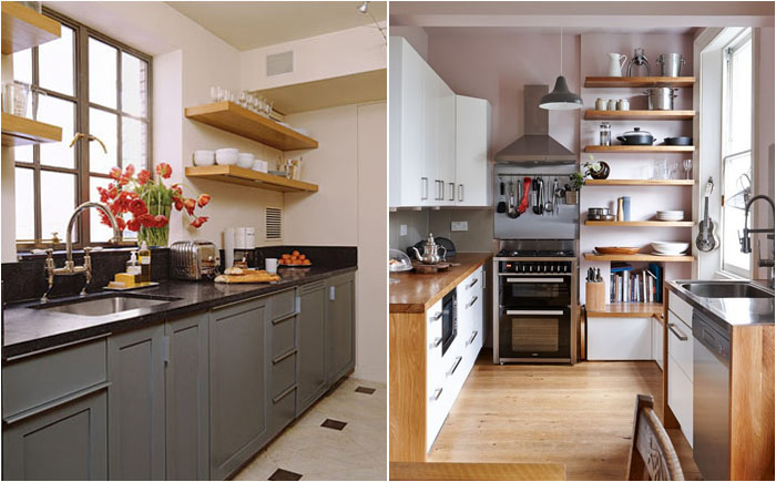 Хотя не всем нравятся открытые полочки, но это простое и разумное решение для хранения кухонной утвари. Они, в отличие от шкафчиков с дверцами, которые загромождают пространство, не только визуально его расширяют, но и помогают легко найти необходимый предмет. Если решились на установление открытых полок, не стоит забывать о поддержании порядка и о том, что на них скапливается пыль.