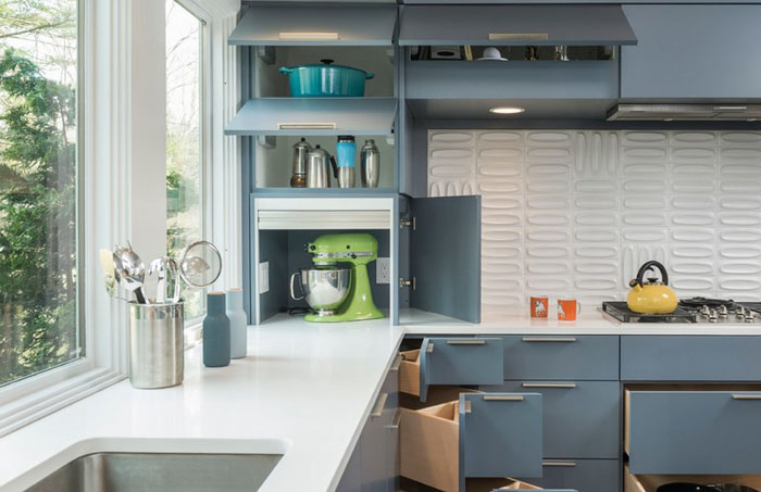Если на кухне очень мало места для хранения утвари – это проблема. Но её можно решить, правильно организовав пространство. Стоит подумать об использовании специальных угловых и вертикальных ящичков, максимально используя пространство в углах кухни.