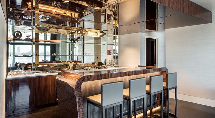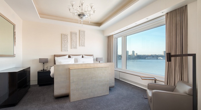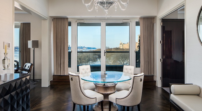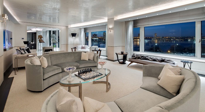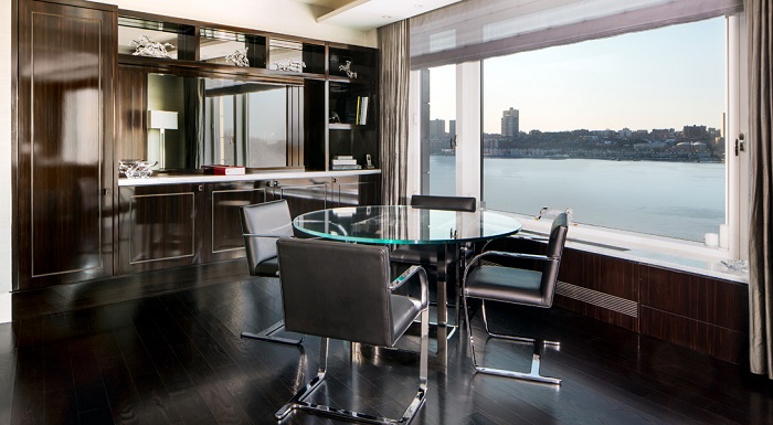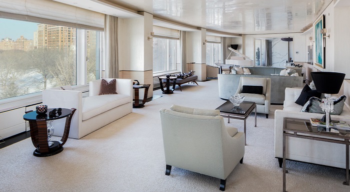 Также в апартаментах есть собственный спа-салон и парикмахерская, спортзал, сигарная комната, которая оборудована отдельной системой вентиляции, игровая комната (или лаундж-зона), 60-ти метровая гостиная и обеденный зал на 18 персон. Практически из всех комнат открывается шикарный вид на Гудзон.